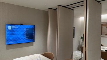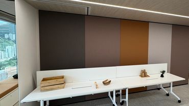 標準防火板屏風達 STC 44-57隔音等級(相當於降低80%辦公噪音),關鍵在邊框氣密設計與 專利互鎖系統,實測距屏風1米處通話聲清晰度降低有效率65%。